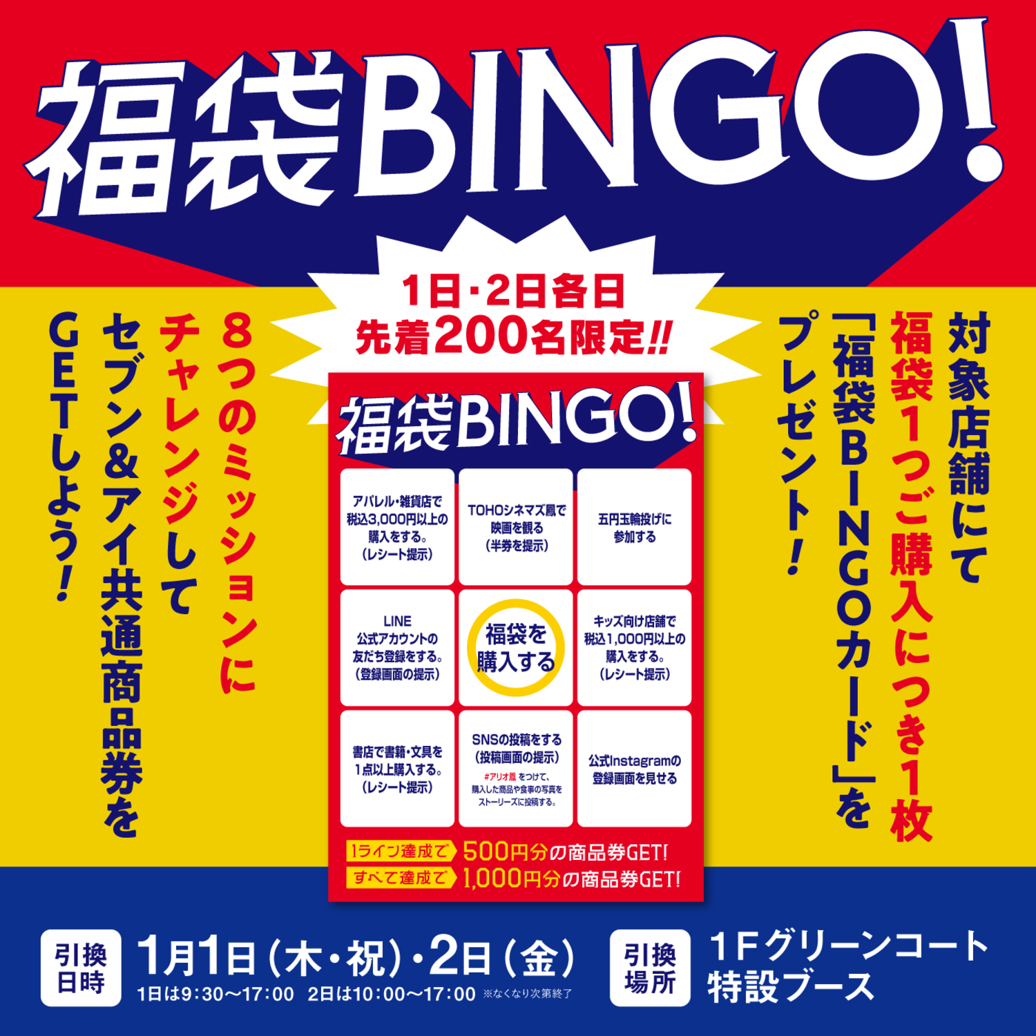 対象店舗で福袋をご購入いただくと1福袋につき1枚「福袋BINGO」を配布します。