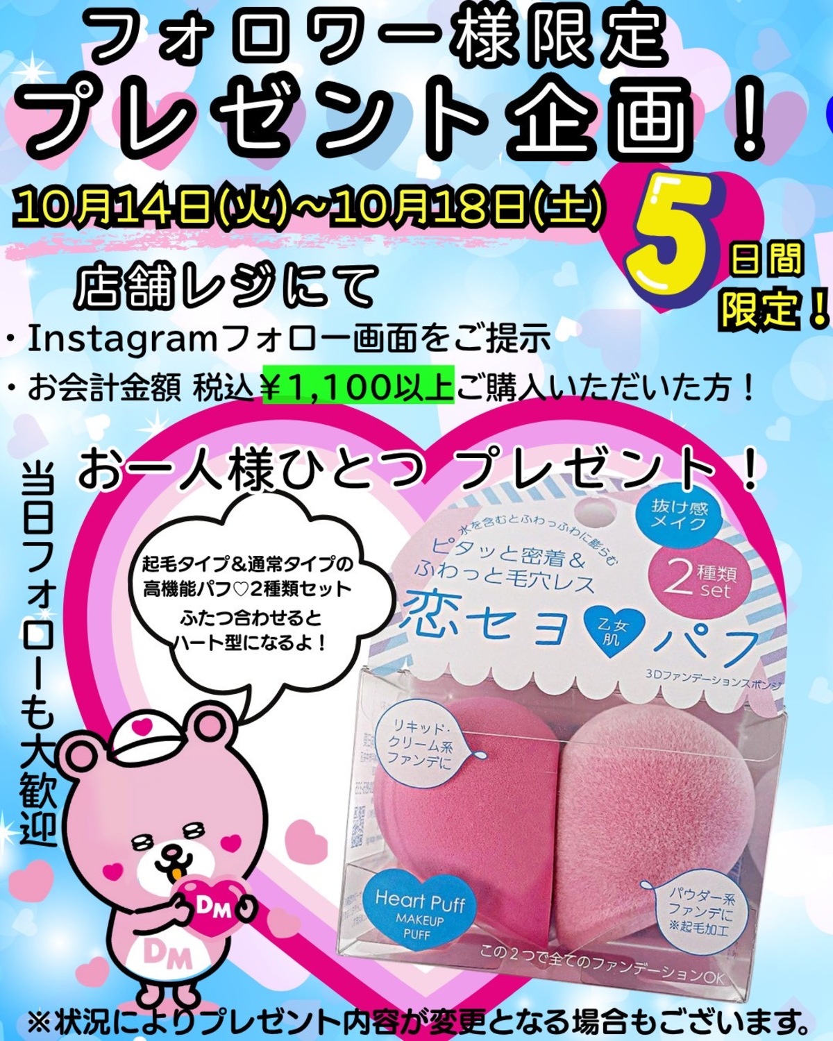 恋セヨ乙女肌♡パフをおひとつプレゼントいたします!!