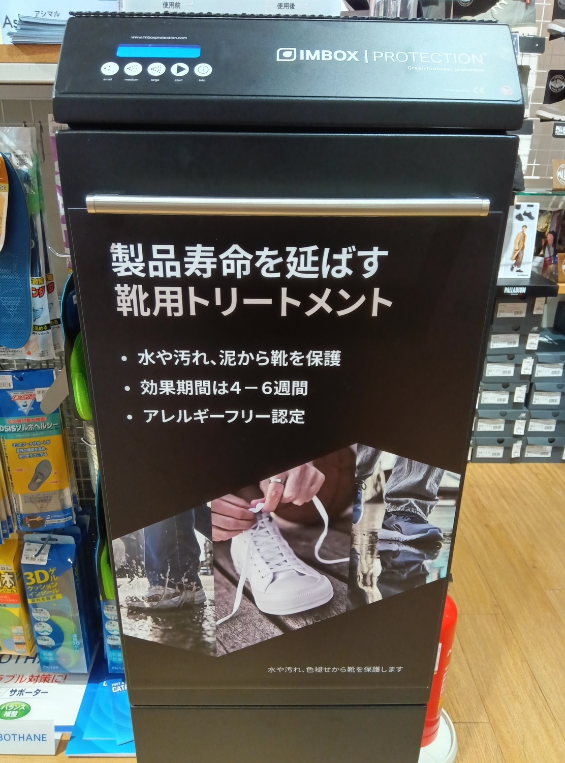 『IMBOX』は、靴をたった1分間、加工機へ入れるだけで、特殊なトリートメント液のミストがコーティングを施し、