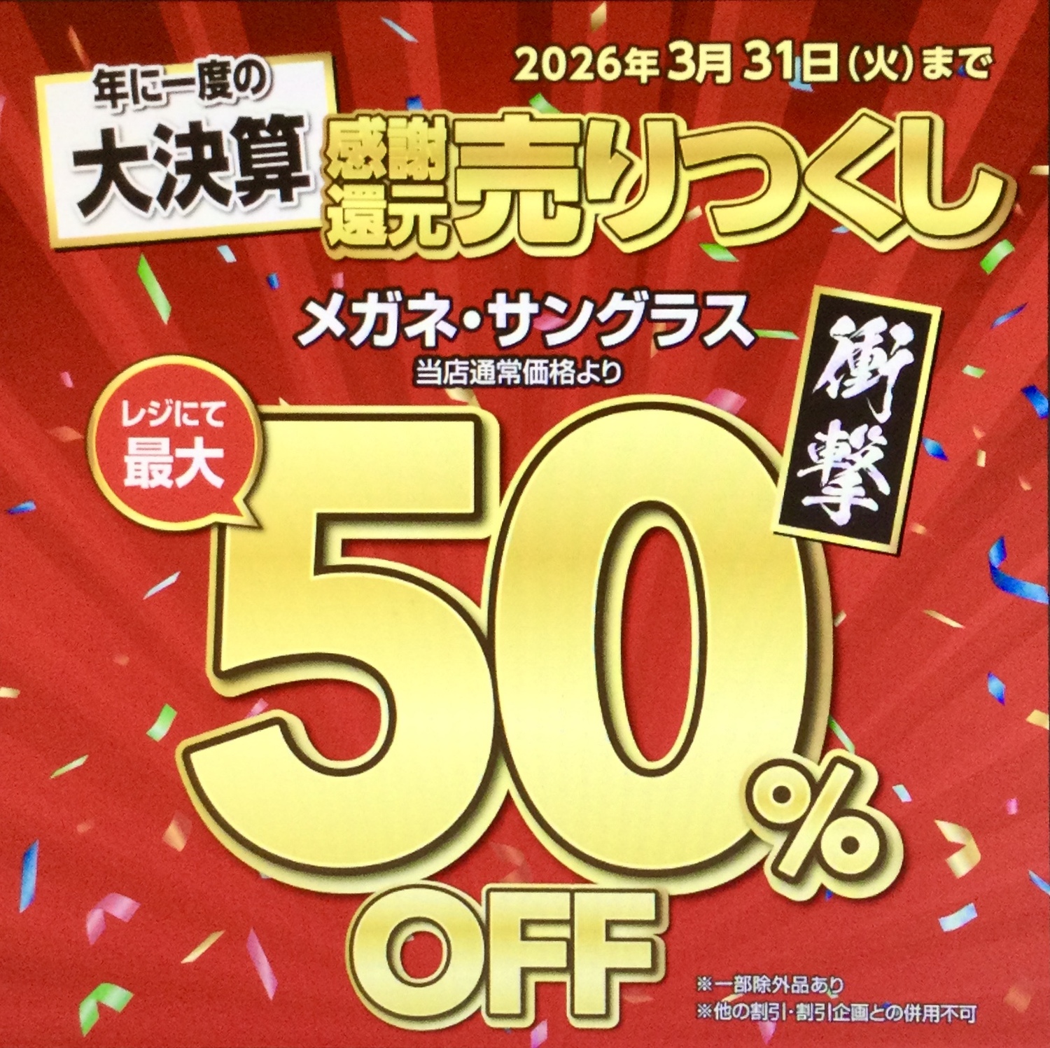 今すぐ使えるトレンドのメガネから、これからの季節に欠かせないサングラスまで、店内該当商品が最大50%OFF。