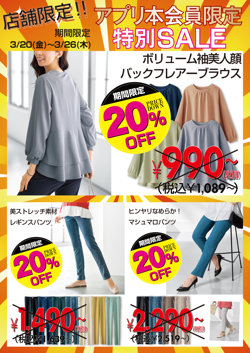 「ボリューム袖美人顔バックフレアーブラウス」&「ヒンヤリなめらか!マシュマロパンツ」&「美ストレッチ素材レギンスパンツ」がアプリ本会員様限定20%OFF!