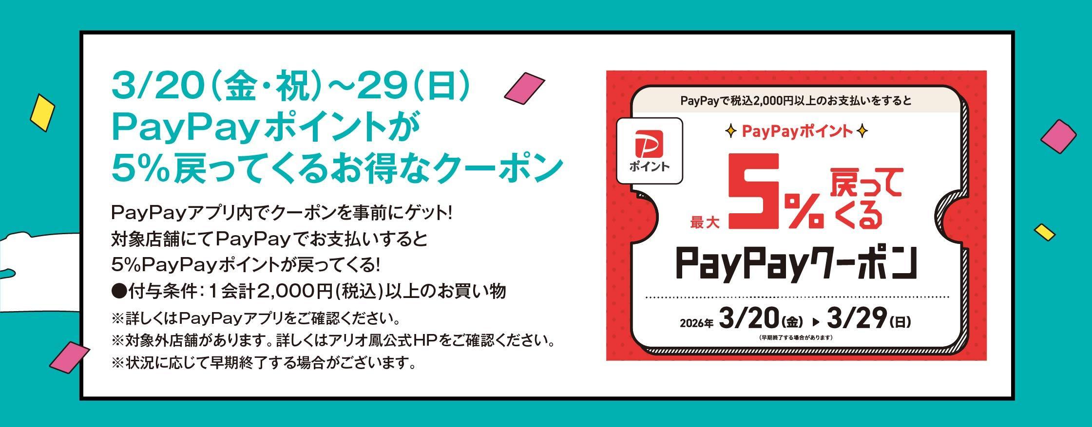 【PayPayポイント】アリオ鳳専門店で5%戻ってくるお得なクーポン